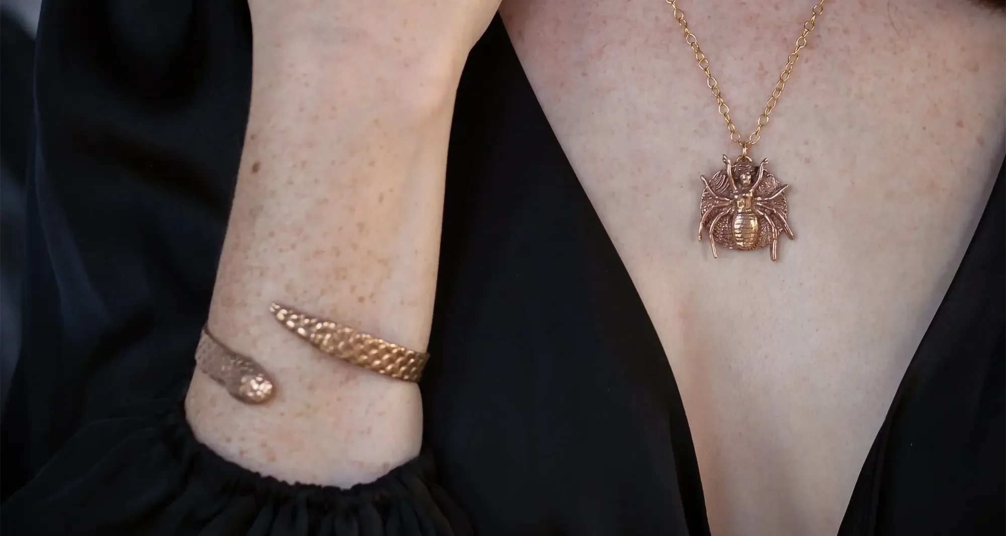 A collection of jewelry items with a little dark side. From bats to coffins, ghosts and serpents.